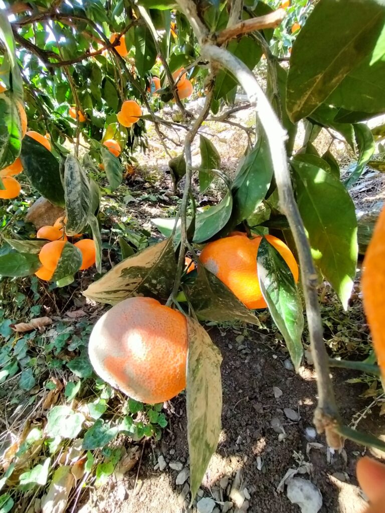 時々、地面に近い葉っぱやミカンに泥が付いていることがあります。これはイノシシが通った痕跡です。