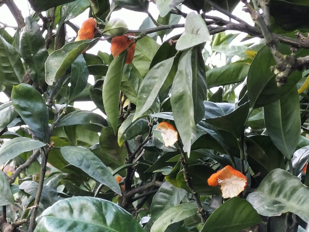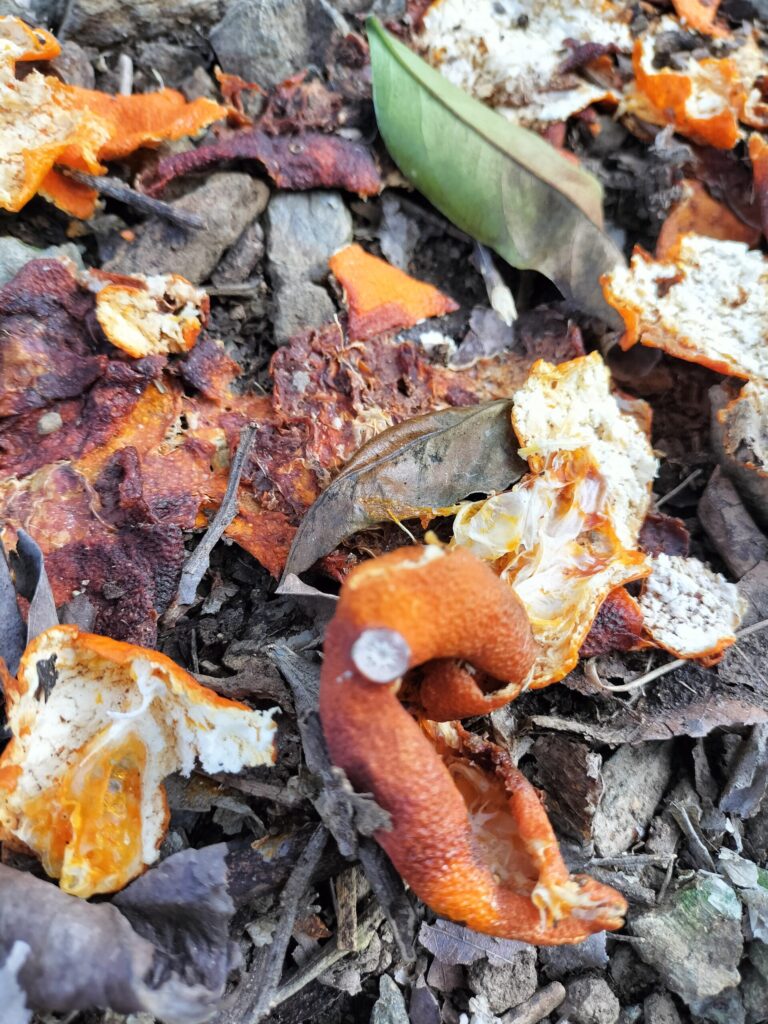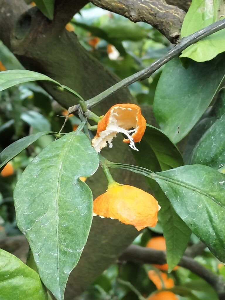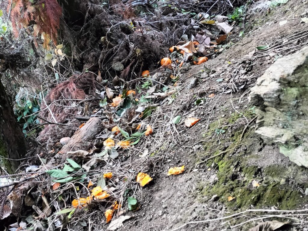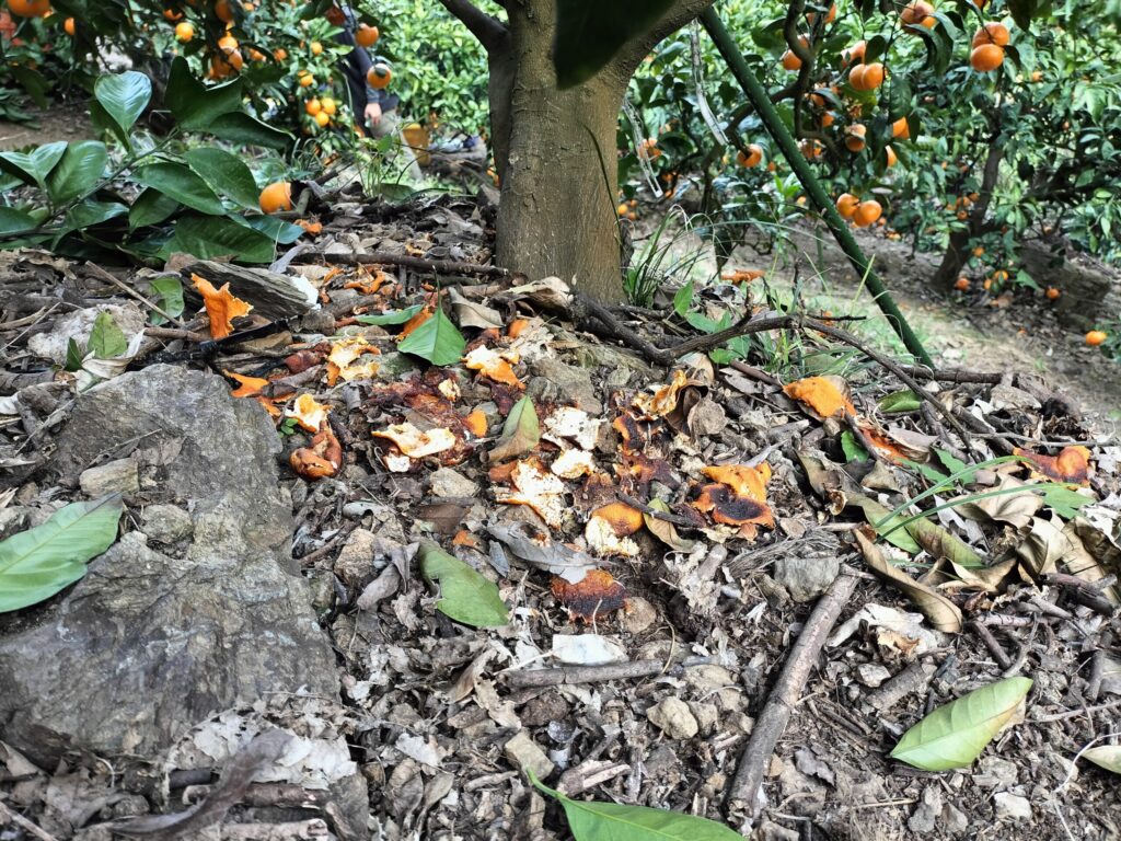 ↓ハクビシンは木に登ったまま上手いこと実を食べます。木の真下には外皮が散らばります。