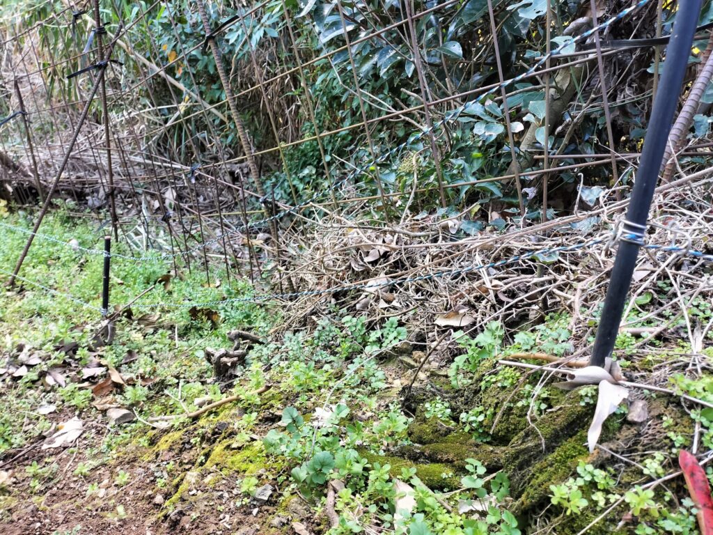 ワイヤーメッシュ柵ギリギリまで木(ツル植物?)が茂っているので樹上から飛び降りて侵入しているのか?とか考えたりもしましたが、それではどうやって出ていくのかが疑問です。なので普通にワイヤーメッシュ柵の格子と電気柵の下をくぐり抜けて出入りしている説を推しておきます。