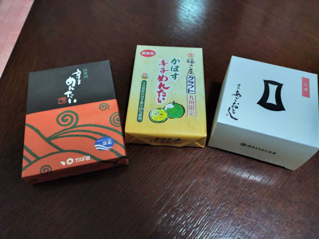 ↓大宰府で買った明太子3種類、宿舎に到着してからほぼ毎食明太子を食べています…(笑)かぼすが大変好みなので帰りにも買いたい。