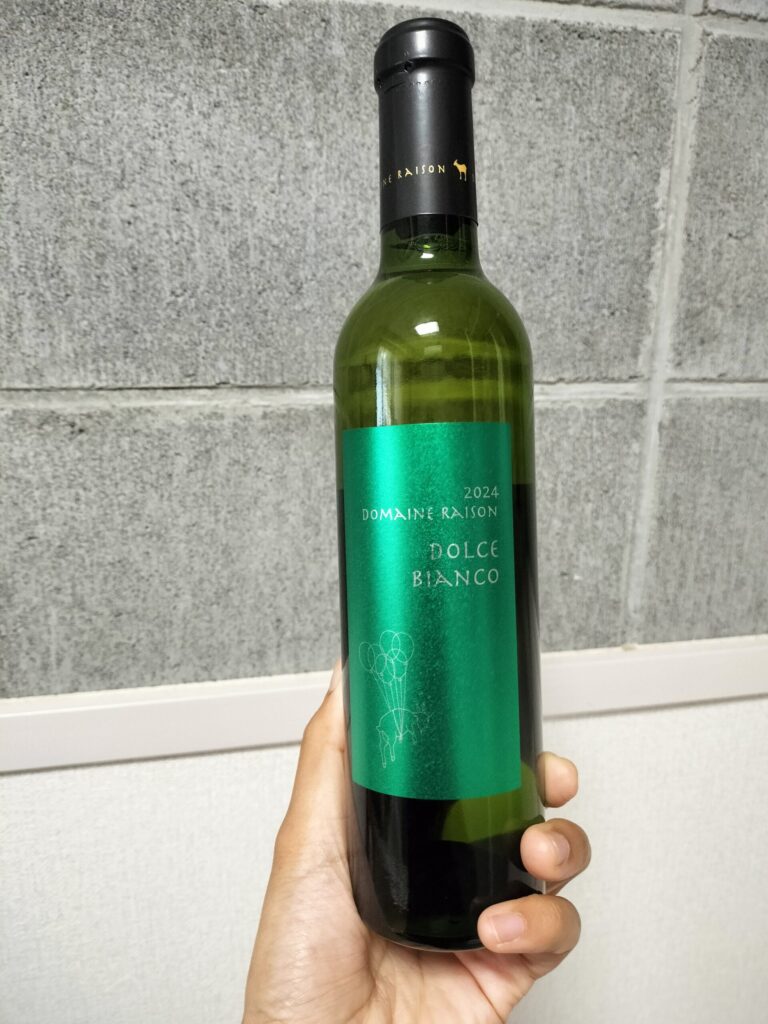 中富良野のワイナリー、Domaine Raison(ドメーヌレゾン)のドルチェビアンコというワインです。赤のラベルと緑のラベルがあり、緑が北海道限定ということでこちらを選択。