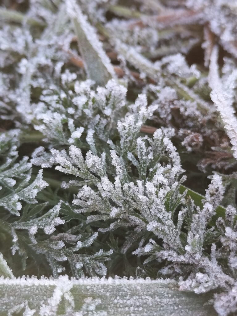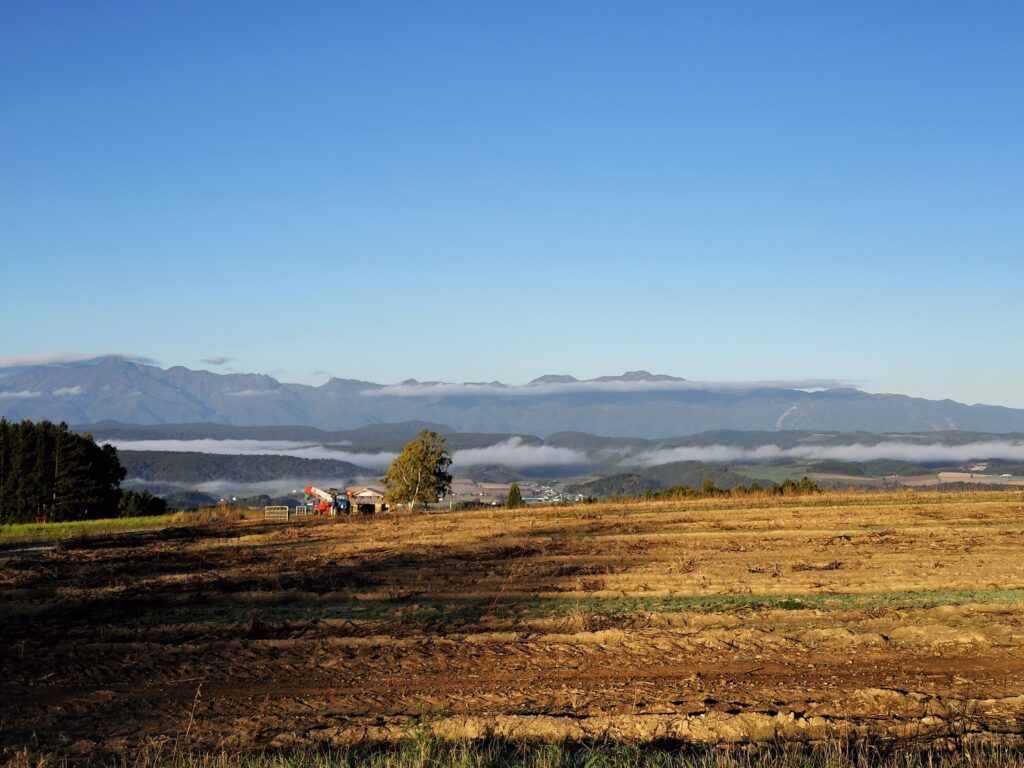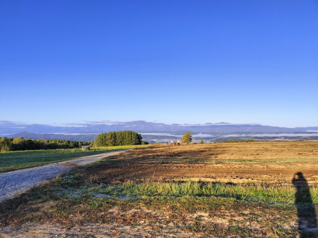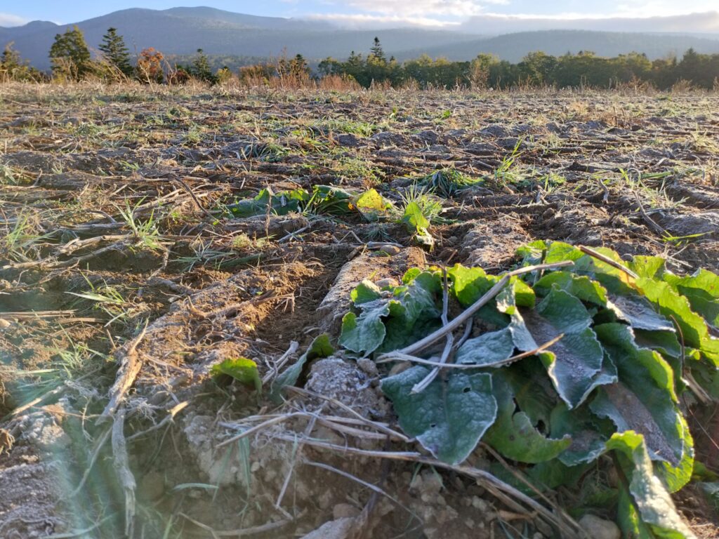 今朝の富良野は2℃予報、麓郷ろくごうにある本日の畑は0℃まで下がり霜が降りていました。