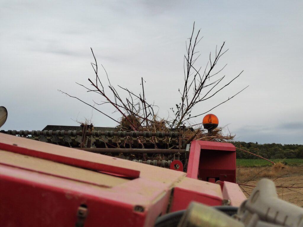 ハーベスタはイモと一緒に掘り上げた雑草を排出する仕組みになっています。…が、詰まってしまいました^^; 何かの芸術作品ですか?